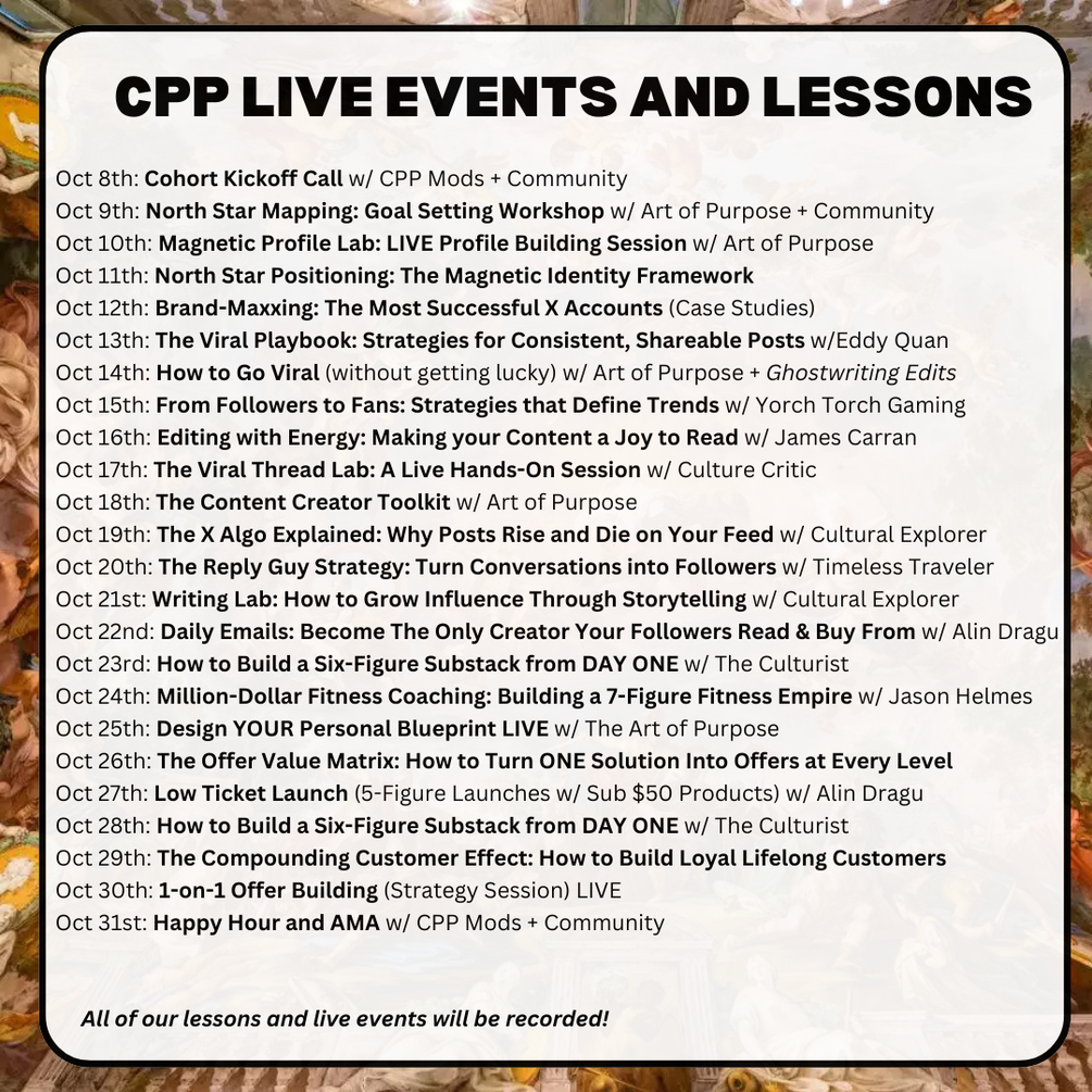 It's okay. Inside the cohort, we’ll break down how creators develop offers, build trust with their audience, and use content to drive revenue without resorting to hype or gimmicks.